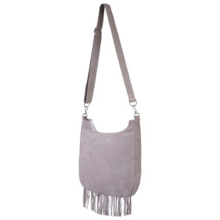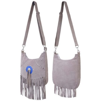 Ladies Grey Suede Leather Western Style Handbag With Fringes and Studs