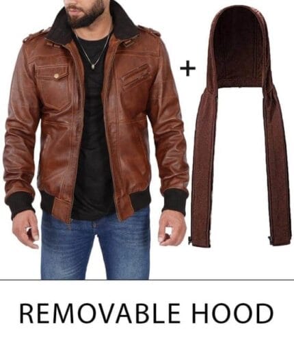 Men’s Brown Lambskin Leather Jacket Bomber Style With Removable Hood