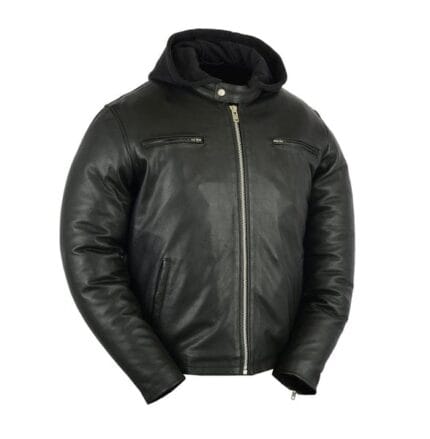 Sporty and sleek, this modern-fit motorcycle jacket boasts a removable hood, reinforced shoulders, and concealed gun pockets for both style and functionality on the road. Featuring heavy-duty zippers, perforated panels, and a high-performance insulated liner, it offers supreme comfort and protection for riders.