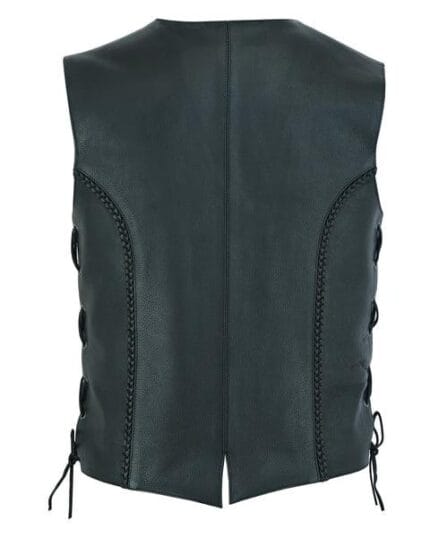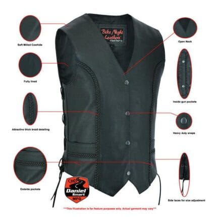 Crafted from soft milled cowhide, this jacket boasts intricate thick braid detailing, concealed gun pockets, and side laces for a personalized motorcycle-inspired look, all while offering comfort with its fully lined design.
