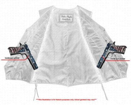 - Two inside concealed gun pockets made of special heavy-duty textile with built-in holsters and snap closure.