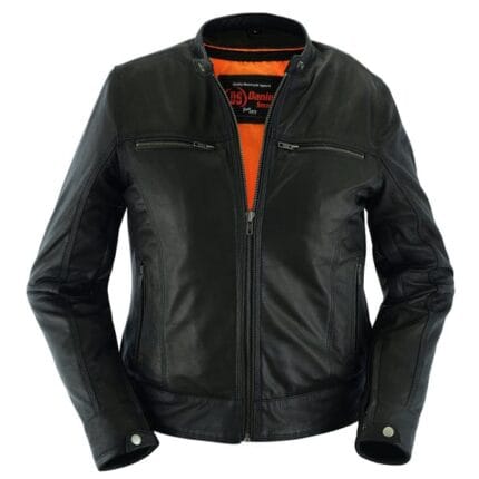 This ultra-soft, drum-dyed brown cowhide vest, ranging from 0.9 to 1.0mm, features a snap-down collar and zipper closure with lacing and stud details. Complete with adjustable side lacing, outside zippered pockets, and an inside pocket, it boasts heavy-duty brass zippers and a stylish, fitted design that accentuates the female form. Available in vegetable brown from sizes XS to 5XL.