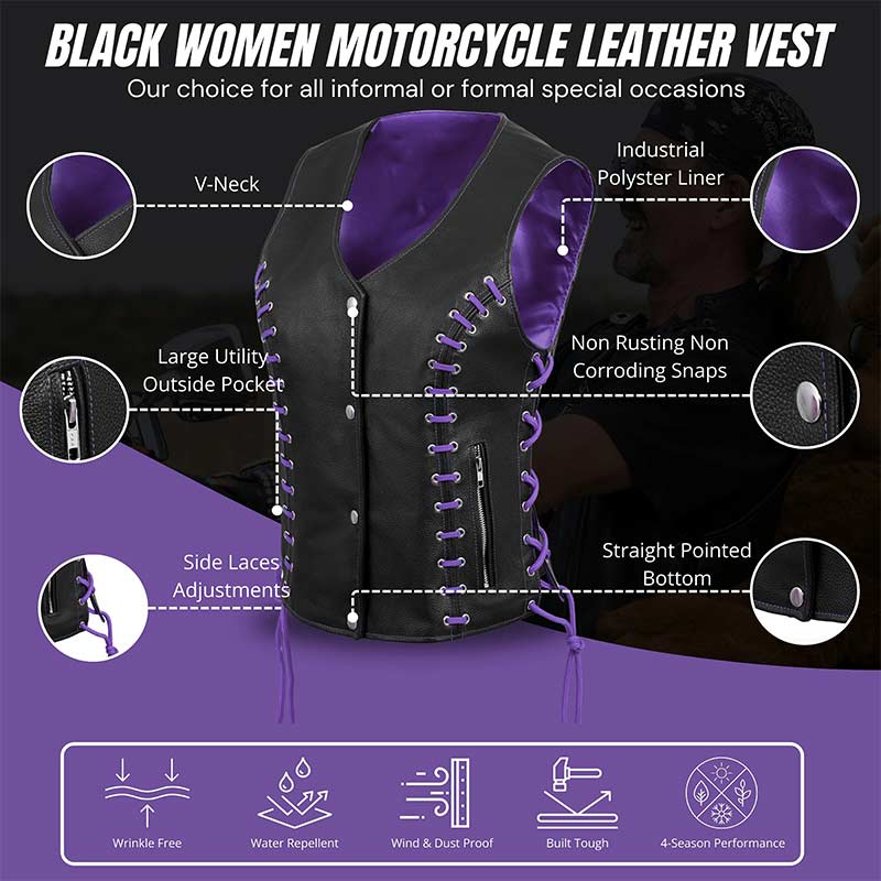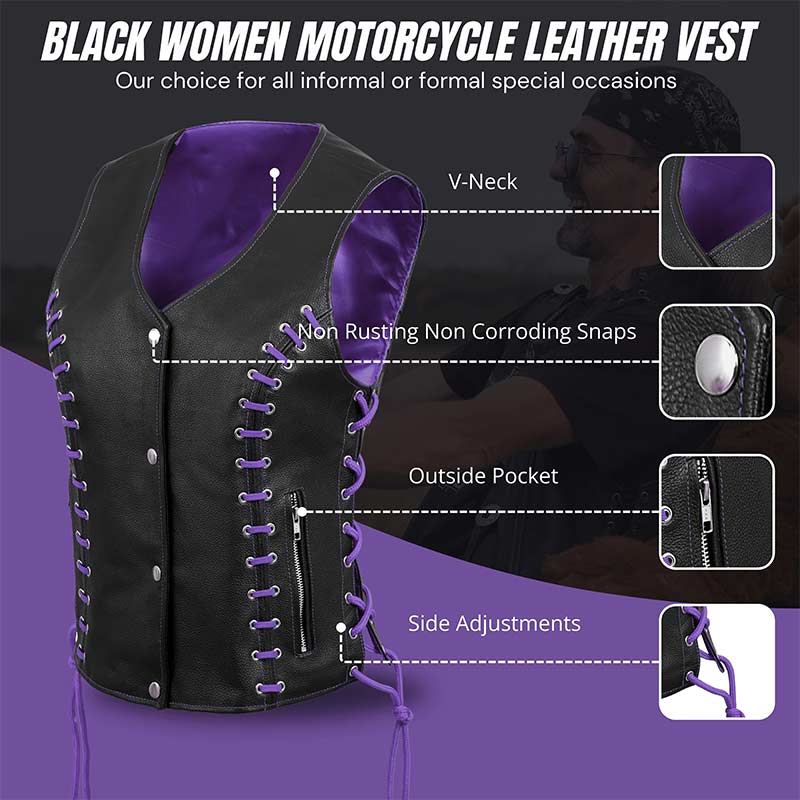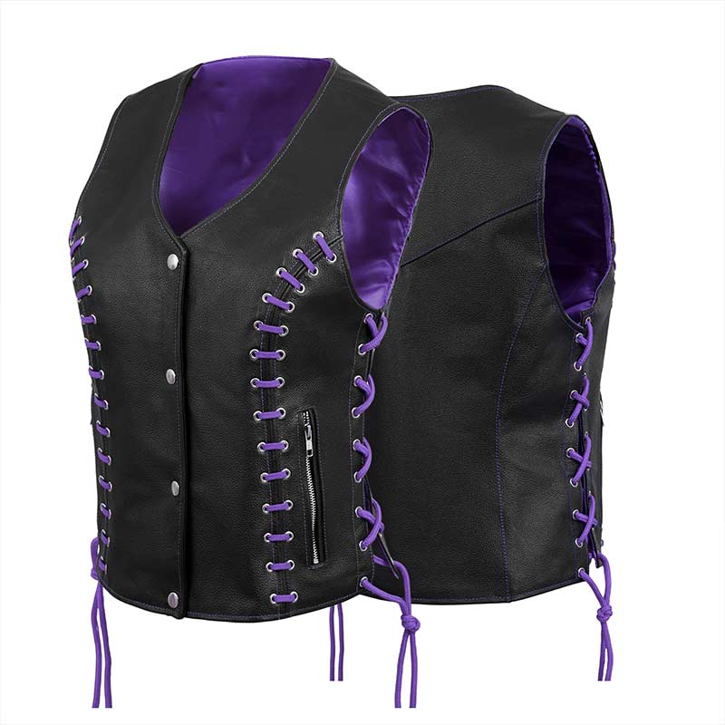 Turn heads wherever the road takes you with the Women’s Black Leather Side Lace Biker Vest with Purple Lining. Designed for confident women who love statement-making biker fashion, this vest delivers a powerful mix of rugged attitude and sleek femininity. The deep black leather exterior channels classic motorcycle heritage, while the tailored cut flatters your silhouette for an effortlessly bold look.
