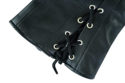 Crafted from soft premium drum-dyed naked goat leather (1.0 – 1.1 mm), these pants feature a convenient side zipper entry. With soft satin underlining, they ensure comfortable riding in any weather. The adjustable side lacing adds a touch of allure, complemented by heavy snaps and durable zippers. Available in black, sizes range from XS to 5X.